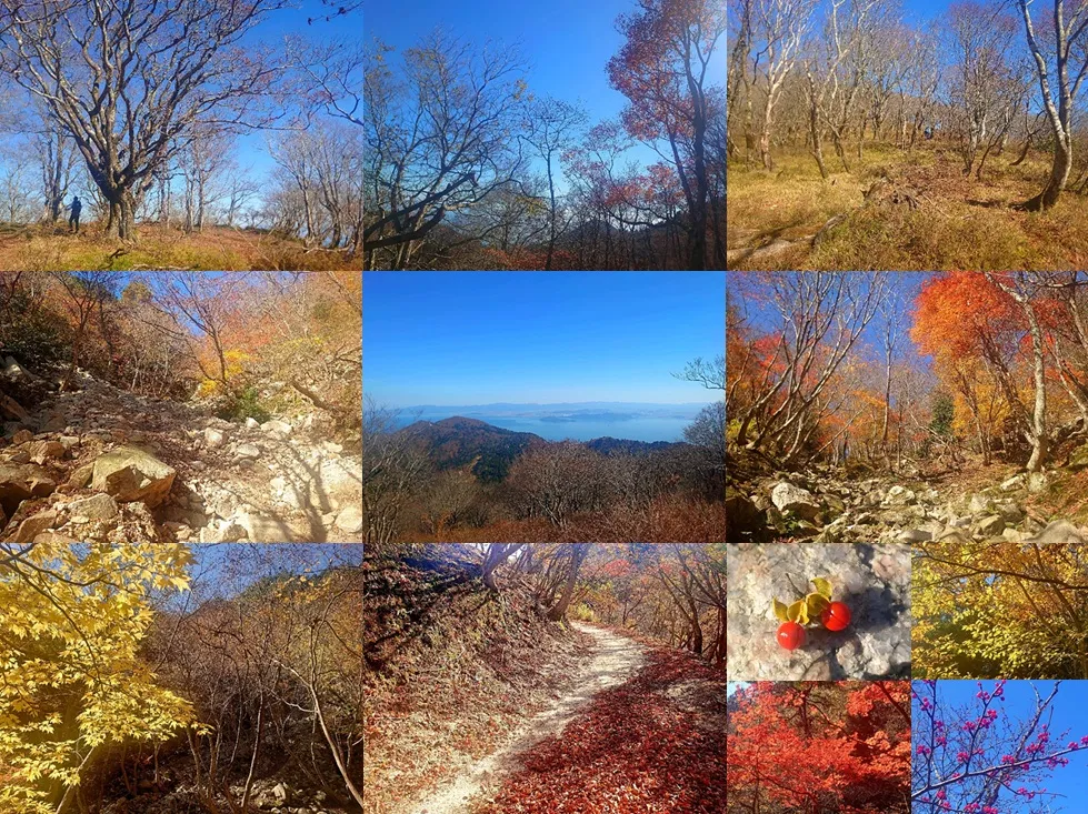 ワンゲル道登山口前の駐車場はほぼ満杯、正面谷の駐車地は見る前に諦めている。秋の比良は実に久しぶりだ。秋は帰りの渋滞が酷くて、真っ先に候補から外れる山であった。ところが真野からは2車線、加えて熊の脅威に怯む方々もあるだろう。来てみれば空いてるだろう予測は見事に外れ、恐るべきは武奈ヶ岳。 今日は皆様の後塵を拝して正面谷を行く。岳道を分け、谷を詰めると懐かしい砂防ダム。考えてみれば、正面谷は恐らく15年ぶりくらい、主に冬期のルートで雪に埋まる記憶が多い。砂防ダムに氷柱がある光景だ。水場の湧水は多少減ったか。砂防ダムを一つ越え二つ越え、何だか体が重くて怠いのは何でだ。長く見ぬ間にあちこち崩れた谷は明るく、興味深いものが多々転がっている。怠い体に有意義なアイドリングタイム。 それにしても、次々に現れては嬉々として消えて行く皆様を見るに付け、どんな衝動がお山に向かわせるのか不思議である。標高差は1000m、楽に登れる山でもなく、この先の青ガレなどはゴロゴロ岩の厳しいルートだ。天上界に続く道ならいざ知らず、顔には笑みさえ浮かべて登って行く。山岳信仰などは一部の極道の所業だと考えている、がこんなに多いと極道の所業と云えるかどうか。 やがて滝の下に到着、沢を渡るとその靑ガレを登る。青と云うより黒っぽい岩の崩壊地だ。陽射しもあって忽ち汗、風の無い上天気で霞が無い。短い水平道の後は崩壊の進む苦しいルートだ。直ぐ先にあるべき峠は遠い。ヘロヘロの態で峠着、腰掛けて微笑むおばちゃんハイカーに見詰められては照れくさい。こんにちは、挨拶をして直ぐによき峠谷目指して谷へ降る。 よき峠谷も、木々は育ち随分変わった。沢も幾らか深くなり、沢沿いのルートは沢の中に移動している。新しい、コヤマノタケへの尾根ルートからおねえさんが降りて来た。中峠・わさび峠を経て坊村に降る周回コースの途中らしい。軽量の靴では水漏れがあろう。そんな事には躊躇なく、見る間に谷に消えて行った。近頃の山靴は軽量なものが多い。 速い若者にどんどん抜かれ、やっと中峠に到着した。エネルギー補給は急務である。風の無い暖かい南斜面で琵琶湖を見ながら小休止。堂満岳は少々鋭角になったかな。杓子木場の頭へのルートは踏み跡が薄い。さて、人の多い武奈ヶ岳を除くとコヤマノタケが目的地。右に登れば特異なブナのコヤマノタケ。初めて見る秋の光景、葉を落としたブナの林のウメモドキは紅一点。枝越しに見る武奈ヶ岳は人で溢れている。 ピークから見下す八雲ヶ原が帰りのコース。ゲレンデ跡を降る途中で体が軽い。八雲ヶ原から北比良峠へ登り返し、岳道を降るのが帰路のルートだ。五体の協調さえあれば困難なルートでは無い。陽射しの中の今年の紅葉は金繍である。