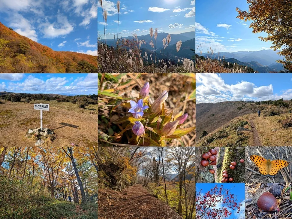 夏には山ビルの出現に尻尾を巻いて逃げ出したルートだが、近頃の熊のニュースを聞く度に胸に蟠る思いがある。熊の出没には多様な訳があるだろう、が恐れ慌てて閉じ籠もるだけでは、恐れる熊を期待出来る訳が無い。山ビルに対する態度も同様だ。たとえ血の数滴を与えたとしても、毅然とした態度でお引取りを願うのが望ましい。今日もし出会う様な事があるならそうしよう。 先行される方々が車5台分、コナラの林もすっかり葉を落として見通しが良い。尾根に乗ったところで高度差300mを越える斜面。見通しが良いので、次第に遠ざかるゴルフ場などを見下し、気散じになるかと云うとそうでもない。秋らしい、葉を落とした枝の赤い実を啄むコガラはとても可愛い。しかし斜面を登る脚の負担が減る訳では無く、しかたがないので立ち止まって汗を拭く。風はとても冷たい。上の方から先行者の話し声が聞こえる。 斜度が緩むと達磨ヶ峰の肩、ここで歩みを止めると後が辛い。背を越えるススキの中にリンドウが咲く。開いた花は一つ、蕾は多い。漢字で書くと「竜胆」、葉が苦いところで着いた名とある。不思議な事に、この後で見たものは全て花一つだけ開いていた。人の知らない符丁があるのだ。登山道に寝そべるヒョウモンチョウはそうした秘密を知っている。踏まれる恐れがあるからススキの中に移動して貰った。 達磨ヶ峰から暫くは快適な尾根ルート。盛りを過ぎた紅葉も綺麗だが、ものの哀れを感じる儚さがある。何れは地に落ちて色を失い降り積もる。その落葉から覗く赤いドングリを手に取ると、それらは全て根を伸ばし始めた子孫達であった。やがて大きな栗の林に差し掛かり、朽木を肌色に彩るものは何だ?。あちこちの朽木に出たナメコ。既に登山者のザックに収まりお土産になったものもある。栗の木の枯れた訳は知らないが、随分星霜を経た木で間違い無い。 折角稼いだ高度を惜しげもなく下げて最低鞍部、ここからの登り返しも辛い。ちょっと剽軽そうで身の軽い女性が追い越していった。遅ればせながら辿り着いたフトウガ峰、背の低い灌木と千島笹の大地、関西らしく無い高層大地だ。先の女性は目の前の岩に登って自撮り写真。この後走って追い越して行った。 さて、残すところは谷を隔てた先の少ピーク。高度差は少ないながら距離はある。やや高度を下げた山腹は燃えている。千島笹の尾根を歩いて段ヶ峰着、風は幾らか冷たいながら、晴れて天気のこんな日にハイカーが四人、お二人は去った後で寂しいピークだ。これにはやはり熊騒動が寄与しているとみて間違い無い。まあ良かろう、汗が冷えるとピークは寒い、峠まで降ってお昼にしよう。 千町峠の、営業状態の不明であった喫茶店(?)は遂に閉鎖、開いている板張の庭の陽だまりでエネルギー補給、後続の男性もご一緒である。この後は林道を凡そ7km、2時間半歩いて周回を完了した。残念な事に、谷の紅葉は盛りだが午後の陽光はほぼ無し。ただ寒いだけの林道であった。山ビルとの遭遇も無し。