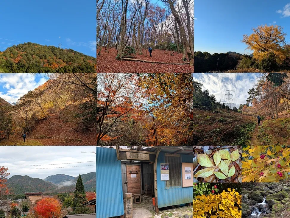 京都の北山辺りに出掛けたい、と思うとどうしても昨今のニュースが気に掛かる。東北から北陸の熊の話題、街角に出るさえ驚きだが、人家の2階、果ては役所に現れ害を為すとは尋常では無い。幸い関西のドングリ類は豊作だし、少ない経験ではあるがお山で逃げるのは熊であった。例外は小熊のある場合で、声を聞くと一目散に逃げる事にしている。だが待てよ、熊だって移動はする。東で度胸を付けた熊が逃げてくれるだろうか?。思い悩んだ挙げ句、向かう先は千ヶ峰、熊用鈴とストックは携行した。 三谷渓谷駐車場はバイクが2台と車1台が先行する。気温は低いが登山用パッチとシャツのお陰で寒さは問題無い。昼間は相当暖かくなる様な予報が出ている。先行者がいるので熊への警戒も無用だ。そうすると、かなり厳しい斜度の続くルートで見るべきものは渓谷と紅葉。雌滝・雄滝の水量は多い。賑やかな渓谷と綺麗な水面に映える苔、勢いよく始めたあとの名残で見上げる斜面がことのほか厳しい。斜度の緩む岩棚を越えると伴走の渓谷とはお別れ、ただ厳しいだけの急斜面、人工林の林床を蠢くように登り高度を稼ぐ。岩座神(いざりがみ)コースと出合いやっと勾配が緩み展望を伺う余裕もできる。 林床に転がるドングリは熊への警戒を解くのに充分な量だ。先行する男性が降って行った。再び斜度が厳しくなると山頂は近い。ススキの背後に見える落葉樹の森が輝いて見える。山頂手前の陽射しの中は、少ないながら可愛いリンドウと草紅葉。少し歩いて無人のピークに到着。好天のピークは久しぶりだ。多少霞みの掛かる遠景は全周囲、吹く風はやや冷たい。 後続が一人二人、笠形山へと続く長大な尾根を、ススキを掻き分け少しだけ辿り、こんなに明るい秋の日に、暗い周回コースは勿体ない。早々にお弁当を拡げる皆様と別れ、久しぶりに岩座神コースを降り集落見物。入れ替わりに7〜8名のパーティが登って行った。このお山ではこれからがもっとも賑やかな時間帯だ。落葉樹の森を抜け、人工林の斜面を降り、平坦な古いお寺跡を降って林道に降りた。紅葉の中のムラサキシキブの実が青い。 集落を見下す、お寺の庭でエネルギー補給。時々スズメバチの翔ぶ庭の片隅に、沢山の実を着けた柿がある。秋の陽射しの中、何とも綺麗な色だ。沢山の実の一つを頂く事は、寧ろ柿への功徳ではないか。何れ木枯しと同時に重力に抗う事なく落ちる定め。仏の慈悲で一つだけ頂こう。綺麗に拭き、かじった途端に溢れる渋味、柿よ、仏の道を説く事を忘れていたな、、。 むかし話の山寺は、集落の真ん中から延びる石段の先にあるのが常である。ここはまさにむかし話、石段を降ると天日干しの稲田、むかしながらの秋の光景だ。たわわに実を着けた柿には説法が必要だが、残念な事に、集落に、住職は不在であった。