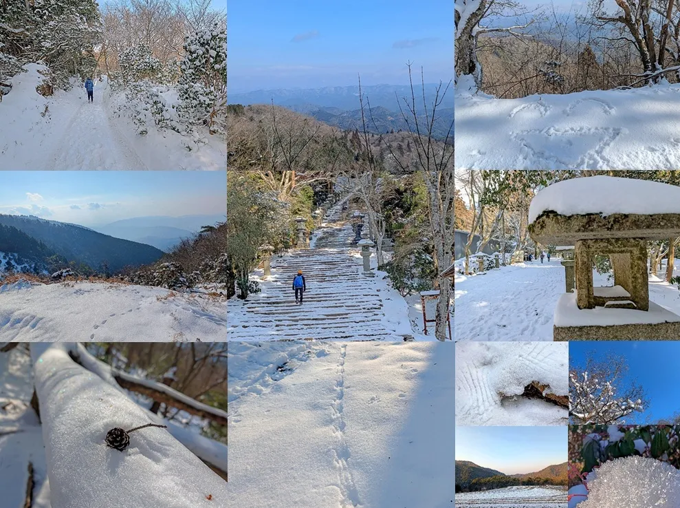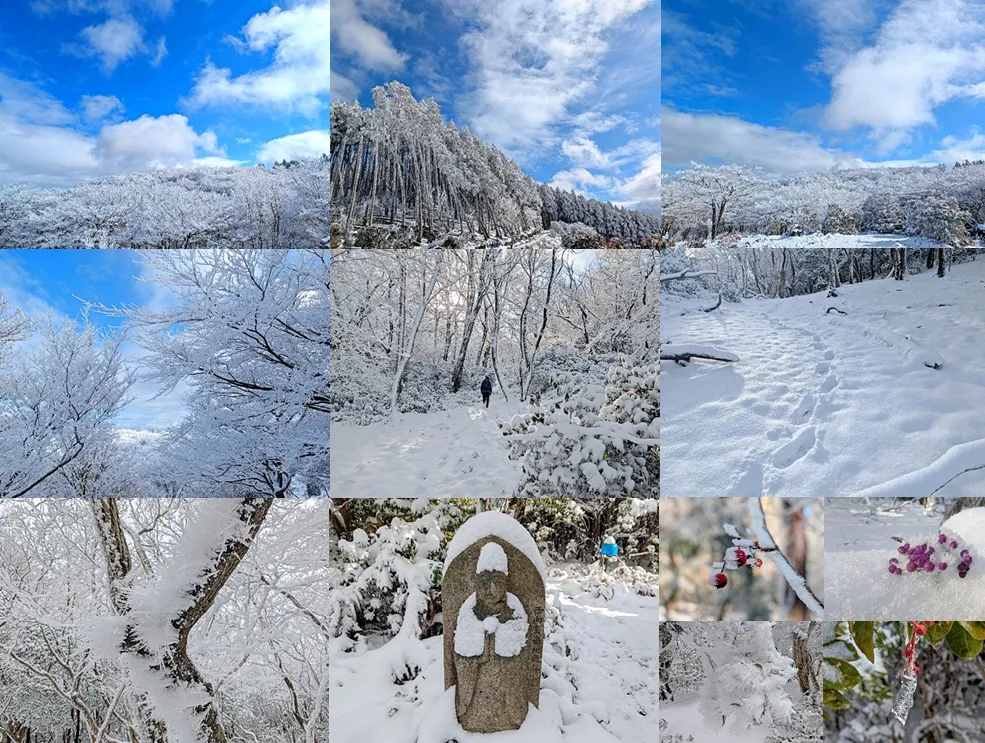 「今後の雪」では、日本海側と比良・鈴鹿はかなりの積雪、今も降り続いている。大雪と言っても、半世紀前の日本海側の積雪はこんなものではなかった。家の庭で、カマクラを作って遊べるほどの雪であった。懐かしい思い出だ。20年前は、比良でも例年2〜3mの積雪はあり、極寒の雪上テン泊で、生死の境を彷徨ったこともある(大袈裟)。かくして、年末にはちょっとだけ雪化粧した地蔵山を歩いて満足していた。近頃は、冷たい雪より暖かいお風呂が所望なのだ。これでは遺憾!!、と思いつつも、車載温度計は-6℃、外に出たい人は変態の類、雪だってマダラ模様で愈々やるせない。 かくなる上は樒原に車を止め、ジープ道で愛宕山へ参拝すると言う、寒さ対策優先の物見遊山。標高差は少ないもののジープ道は、車両の道としては恐らく群を抜く斜度のキツい道である。未舗装どころかとても歩き難いダート道、雪が着くとそれはそれは歩き辛い。一般車両の無い薄雪の駐車地に着き、暖かい車から見回した景色の寒々しさ。ところが歩き出した府道はそれほども寒く無い。発熱分は自家暖房に使える風の無い朝だ。謂わば、熱の簒奪者の無い状況と云える。 雪と氷でツルツルの府道は注意が必要。ここでアイゼンなどを着けたりしては顰蹙を買う。無事に旧参道に辿り着き、ゴロゴロ石の隙間を埋める雪には惜しみ無い感謝の辞を表明しつつ、何とか無事にジープ道へと到達した。ご苦労な事に、凸凹斜面の雪の上には往復分の轍の跡が刻まれれいる。更には、轍の跡にソールの減った登山靴の跡が一つ、直ぐ上辺りを行く高野聖の足跡であった。しかし、今の時期には山ナマコは無し、飛騨は遠い。 黙々とルージュのコースを登り、自家暖房の熱で汗ばんで来た。先行者の背中は拝むことなく、神明峠出合い手前で斜度は緩くなる。ここまで、人の影に代わって多いのはネズミの痕跡。あっちにもこっちにも、尻尾と二本の足で移動した様子が残っていた。まるで雪祭でもあったかのような賑わいだ。ヒメネズミなどのそうした賑わいは、他の動物の嫉妬の対象らしい。恐らくはカラス、の妨害の様子さえ雪はとどめていた。 賑わいが去り、峠に続く足跡が一つ、途端に何やら不吉なものが辺りを覆い、悪霊退散の願いも虚しく、風は起こり気温は-10℃、露出した顔の皮が凍り付く。これは別名「冷感エステ」とも云う美容法ではある。が、強要されてはたまらない。雪の林に逃れ、何とそこは結界の中か、溢れる日差しもあり暖かい。結界で暫しの休息を入れ、目の前にある愛宕神社へ、いざ参拝しよう。 流石に雪の愛宕山、地蔵山にも竜ヶ岳にも踏み跡を残す方々がいて、首無し地蔵から、月輪寺方面から集う方々、この時点で、10人ばかりの予測は外れ、表参道の神社前では人波さえ出来る様子、流石に冷え込む木陰に人影は無い。